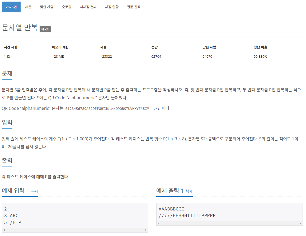 테스트 케이스 수를 입력받은 후, 입력받은 문자열이 반복 횟수만큼 반복되게 하면 되는 문제다. 단, 문자열 전체가 반복되는 것이 아니라, 문자열의 각 자리가 횟수만큼 반복되면 된다. 3 ABC의 경우 AAA / BBB / CCC로 각 자리가 3번 반복되면 된다는 것이다.