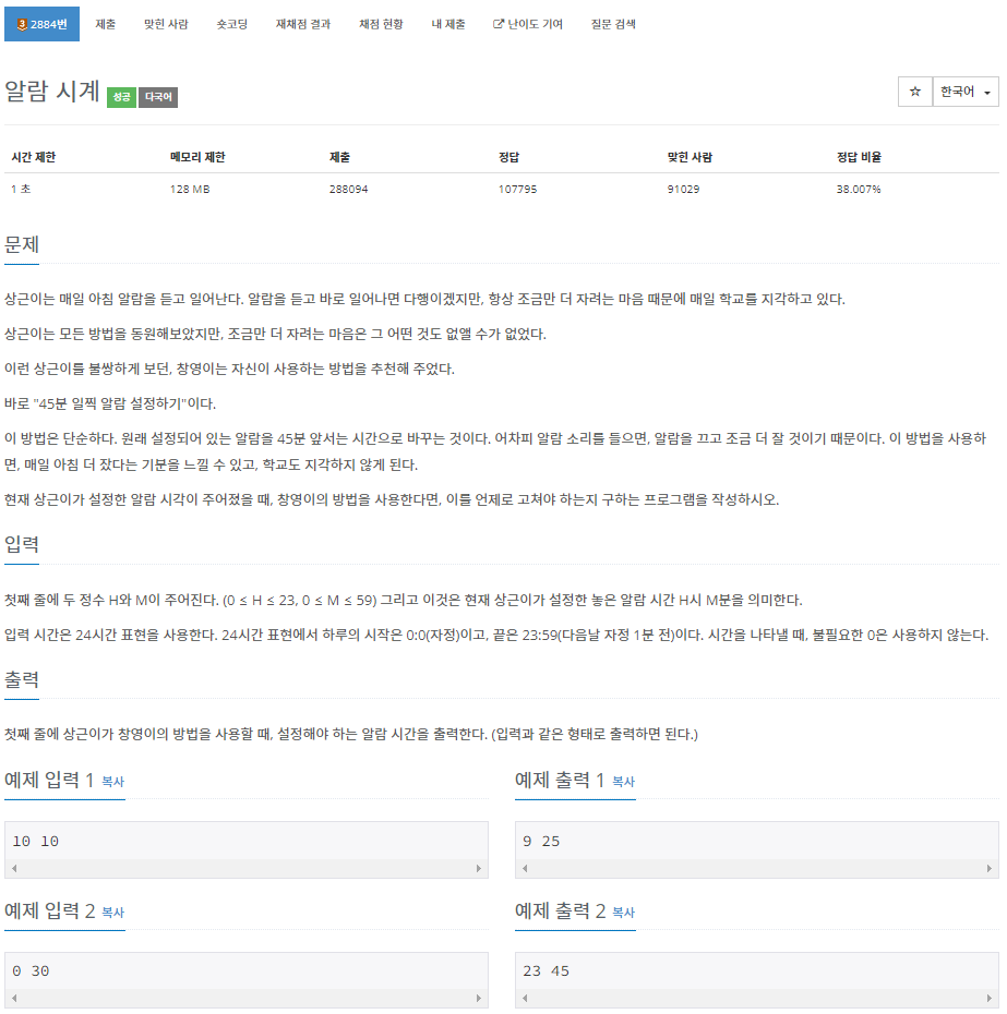 int m = Integer.parseInt(st.nextToken()); // 분을 입력받는다.