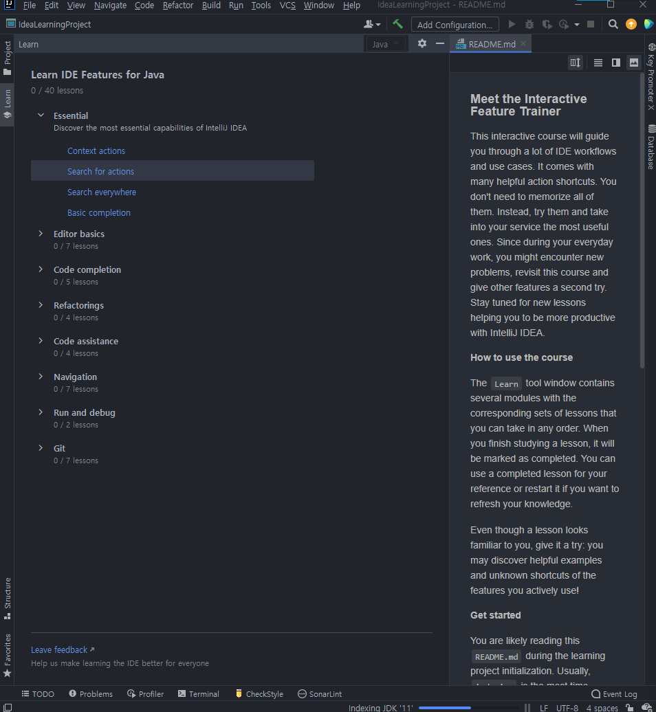 이런 화면이 뜬다... IntelliJ의 모든 활용법을 집약해서 연습할 수 있게 만들어 놓았다.. 진짜 젯브레인즈 돌았다ㅋㅋㅋㅋㅋ 너무 좋은 정보라 나만 알기 아쉽기 때문에 이렇게 공유를 하게 됐다.