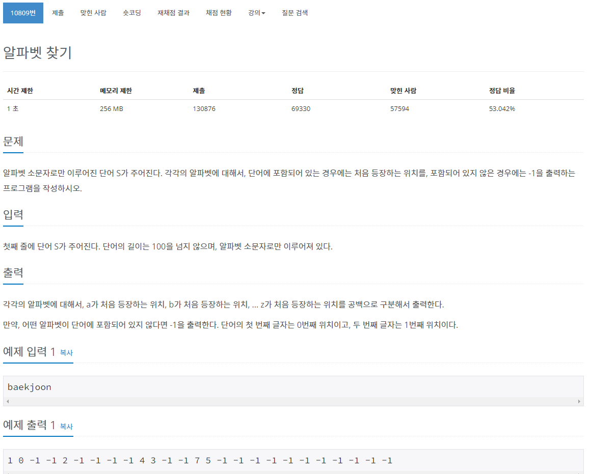 예제를 설명하면, b, a, e, k, j, o, o, n 이라는 문자열 안에서 b가 몇 번째 자리인지, a가 몇 번째 자리인지 표시해야 하며,